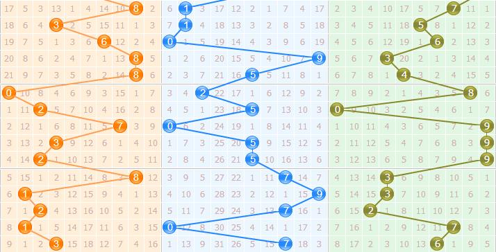 和值分析:从近期整体和值走向看,和值来来回回总体上还回到中间区域内的,本期关注和值10、12、14,另外防一个大和值19。