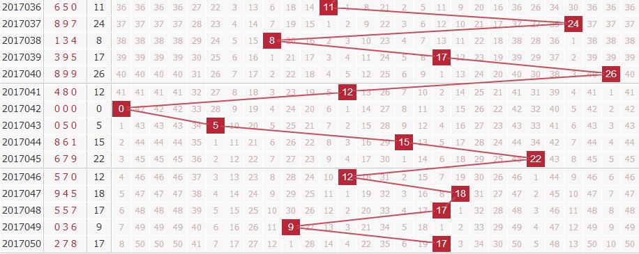 在除3余数走势中,上期开出余2路,本期依其走势推荐余1、2路;依其上面分析,除3余1、2和值推荐:10、14、16、20。17051期和值依其走势关注10、14、16、20。重点关注和值14、16、20。