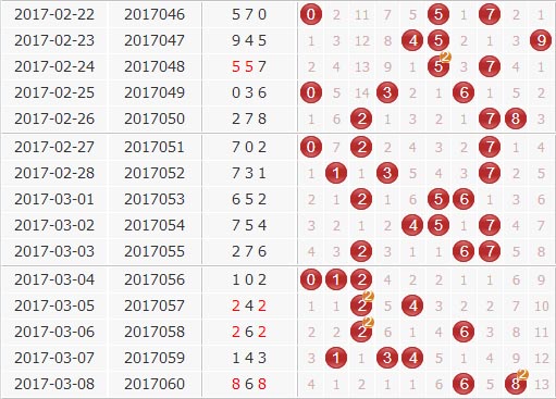 跨度分析:上期的跨度2,是一个质数跨度,分析近期跨度的质合走势来看,质数跨度最近走势很热,开出的力度也很大,本期也看好质跨度的连开。跨度重点推荐:3 4 5 9。