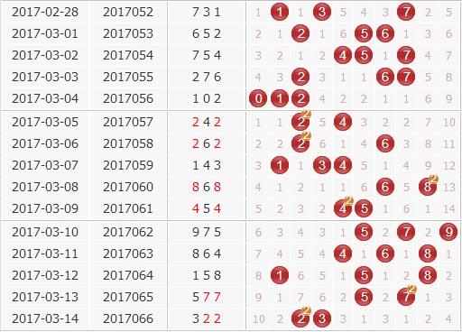 个位:上期的个位开出了2号球,振幅为5,是一个大振幅,个位上大振幅开出的不怎么常见,一般都是小振幅居多,本期也是关注小振幅的开出。