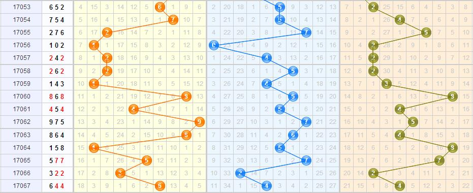 个位数是最难判断的,开出4到8有3次,到5有2次,到0、6有1次。首先排除1路的号,再排遗漏期数多的9、0,几率小的2、8,本期选择3、5、6。