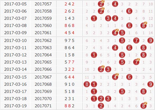 百位:上期的百位开出了8号球,最近百位的出号都是呈现一个在大小号之间来回移动的趋势,之前是从小数往大数移动,现在是明显的往大数移动,而且都是小振幅比较多,本期看好比8号小的号码开出。