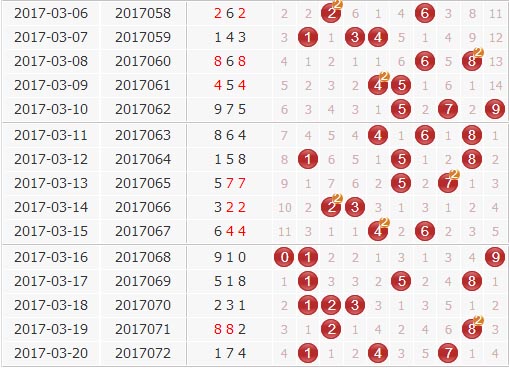 回顾:第17072期开奖结果为:174;奇偶形态:奇奇偶;大小形态:小大小;和值:12;跨度:6