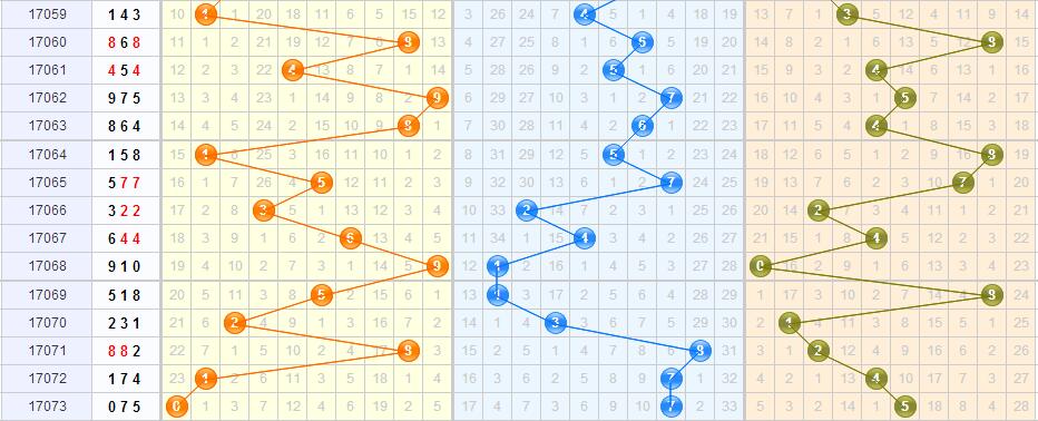 上期开出075,和值12,1偶2奇,1小2大,百位0遗漏23期、十位7重复,个位5遗漏10期,从整个出号来说,总遗漏值达到33期,说明有较冷的号出现。而除3余数形态012路。