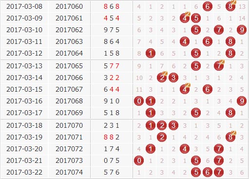 百位:上期的百位开出了5号球,分析百位上的走势来看,大数近期的开出都是一次独开然后一次连开,上一次开出大数是只开出了一期,所以本期看好大数的连续开出。