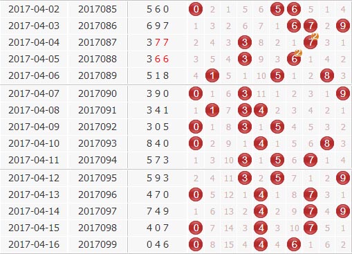 回顾:第17099期开奖结果为:046;奇偶形态:偶偶偶;大小形态:小小大;和值:10;跨度:6,开出了组六。