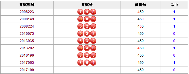 开奖期号2017063 开奖号864 试机号450 命中1