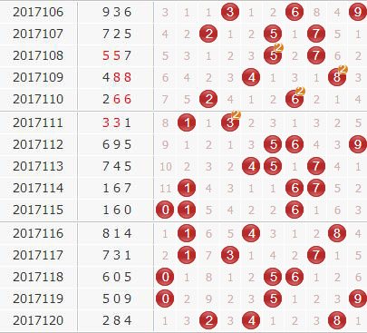 2、组三号码分析:组三号码近期应防回补开出,主防对子3、7。