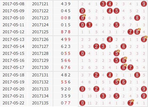 和值:上期的和值是14,从最近几期的和值走势来看,最近几期的和值活动比较稳定,基本上都在中间区域范围内活动,本期继续看好这一范围内的和值的开出。本期和值推荐:10 11 13 16