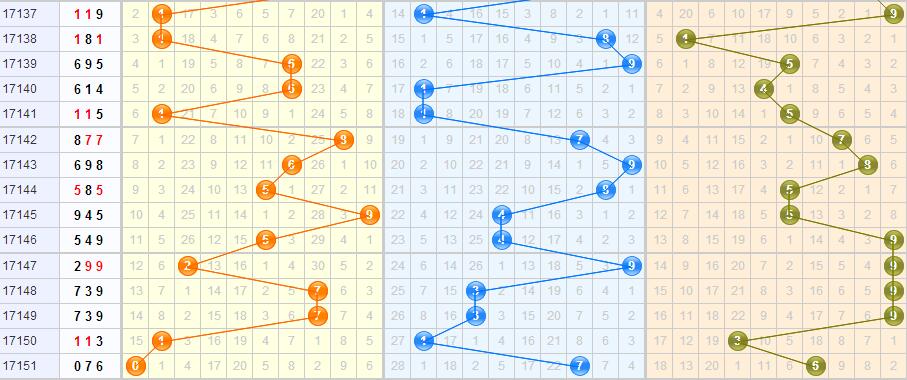 和值:上期开出小区和值13,和值呈现出走小的趋势,本期应关注走小,关注和值13、15、17开出。