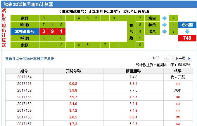 本期试机号胆码计算器推荐胆码:748