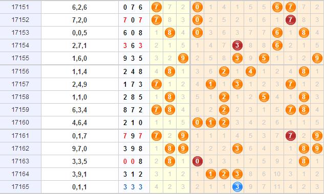 跨度走势分析:近5期跨度呈现2-6-8-2-0,在近11期的跨度表现中均出现了偶跨,并且目前跨度在中部区域内有比较长时间的空缺,本期重点关注跨度456。