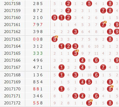 回顾:17172期开奖结果为:558;奇偶形态:奇奇偶;大小形态:大大大;和值:18;跨度:3