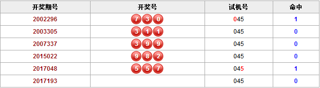 开奖期号2002296 开奖号730 试机号045 命中1