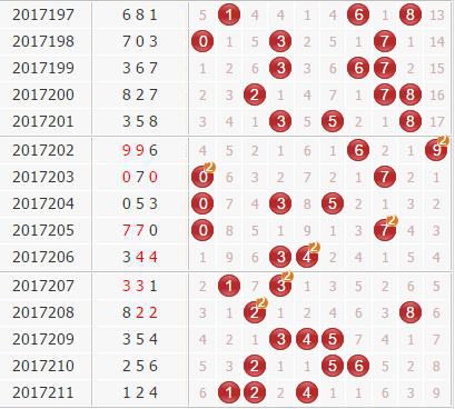 3、和跨分析:和值主防点位是在中或大数区,看好13-22点;跨度主防中大数开出,0路跨度6是重点,接下来紧盯4跨,次防8跨。
