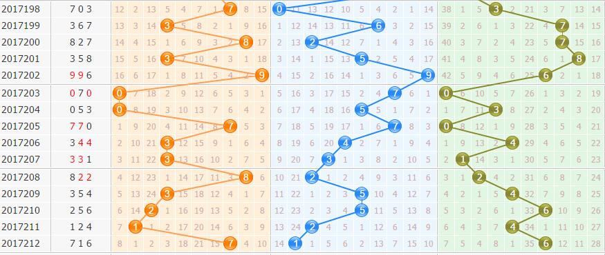 重复号:716的开出使得号码17继续走热,号码6由冷转温。本期关注重复号码个数为1个,关注金码7开出。