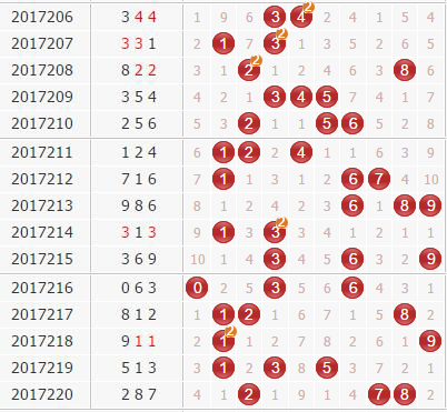 2、组三号码分析:组三号码近期出现中小号对子较多,后期主防大号对子8、9等。