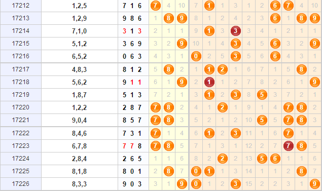 回顾上期的开奖结果为:903,大小小、奇偶奇的组六形态,和值是12,跨度为9,结合综合走势图看,近期不少冷号已经重见天日了,只有一个4号一直迟迟不曾出现,导致现在还需要盯防着,而近期几个开出的冷号回暖还是比较积极的,这几期可关注一下走热趋势。