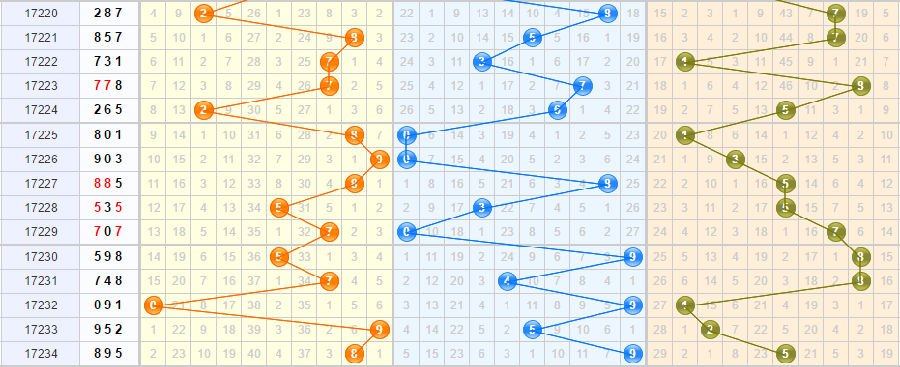 回顾:17234期开奖结果为:895;奇偶形态:偶奇奇;大小形态:大大大;和值:22;跨度4;