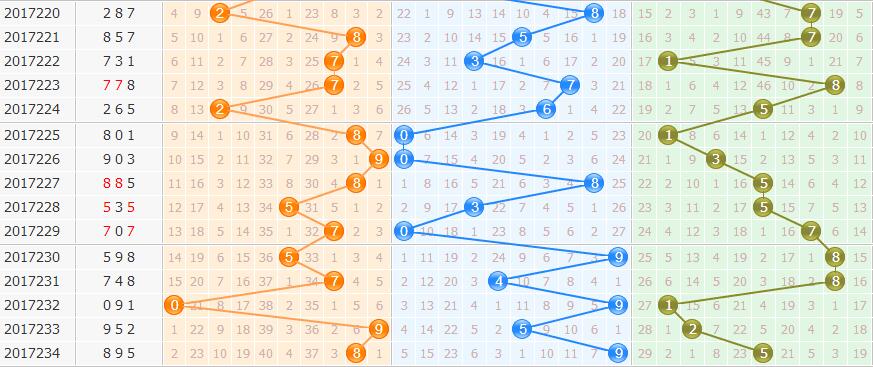 上期开出895,和值22,2奇1偶,全大,百位8遗漏6期、十位9遗漏1期,个位5遗漏5期,从整个出号来说,总遗漏值达到12期,说明有较热的号出现。而除3余数形态202路。