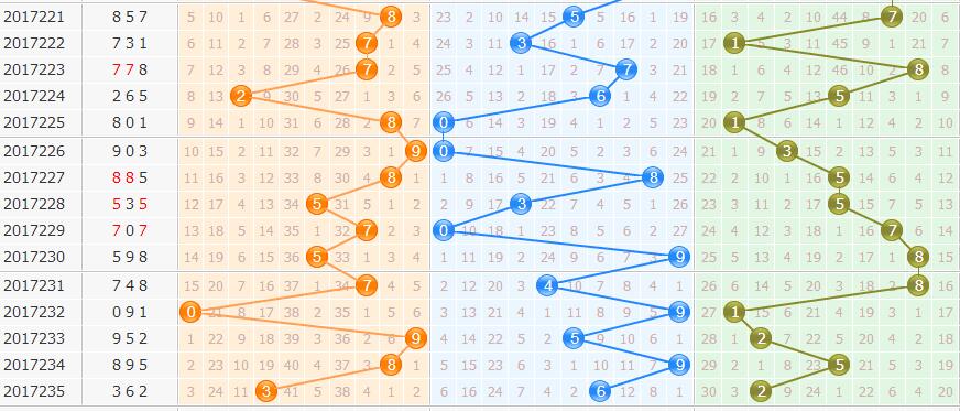 从近50期看,开出3有10次,到8有2次,到3、4、9、2、0有1次,重复1次。我们从“遗漏表”中得出。首先排除0路的号,再排遗漏期数多的4,几率小的8、5,本期选择1、2、7。