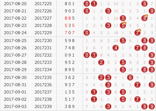 冷热综合分析:从近期出号的综合走势图可以看到,目前0号和4号持续冷态,0号实在是孤立无援了,而4号相对来说由于3号的热出依旧还有翻身的机会,同样之前都是冷号开出,6号球也有走冷的危险,热号上面就3号和9号出号势头最猛,本期依旧可关注起来。