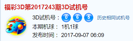 福彩3d第2017243期试机号:065