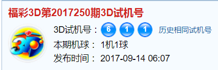 福彩3d第2017250期试机号:611