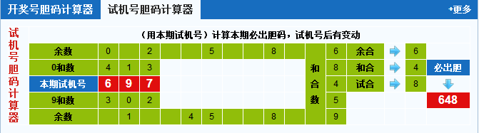 本期胆码计算器与试机号重合一码6。6号球已经连续两期在试机号出现了,可见其复出心切。而目前6号球也仅间隔两期,又是近期余地充足的大号,本期6号球值得一防。
