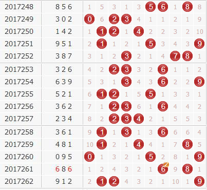 2、组三号码分析:组三号码前期出现中大号对子较多,后期主防中小号对子0、1、2等。