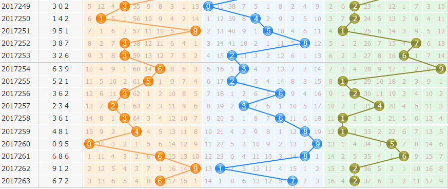 百位:上期的百位开出了6号球,还是大号码的开出,不过出号已经开出走小了,本期也主要关注小号码的开出。