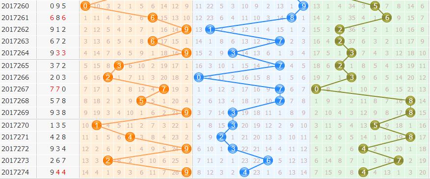 本期百位大、偶、冷、0路是本期号码的首选。从上面的条件中我们首选6这个号,次一级是7这个数。