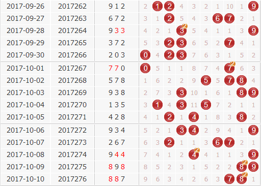 综合分析:从上期开出的号码来看,上期开出了组三,组三重新开出后连续开出了三期,看来最近组三的出号开始转热了,本期是否会继续开出,还是需要设防的。0号球目前的遗漏值已经达到了9期了,0号球之前的最长遗漏过10期,已经是比较接近了,本期需要留意0号球的重新出号。6号球目前间隔3期没有开出,在本期是上期7号球的邻码,近期邻码的出号形势较好,本期看好6号球的开出。本期综合推荐:023569