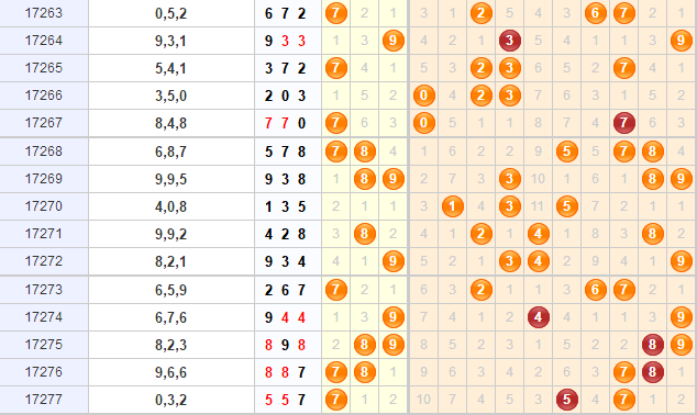 回顾上期的开奖结果为:557,大大大、奇奇奇的组三形态,和值是17,跨度为7,结合综合走势图看,目前号码都在大数上接连出现,斜连号出现了两条,逐渐向中间位置移动,本期中段区域号码可以重点关注。