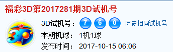 福彩3d第2017281期试机号:760