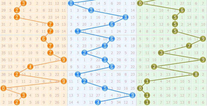 二、其次在十位上,开出了一个4号,十位上前段时间在中间区域热号频频出现,近期才开始向两边发展,且冷号落号较多,本期看好3和7。
