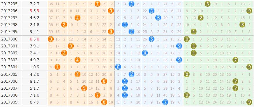 从近50期看,开出8有4次,到5有2次,重复1次。我们从“遗漏表”中得出。首先排除2路的号,再排遗漏期数多的6、9,几率小的7、4,本期选择0、1、3。