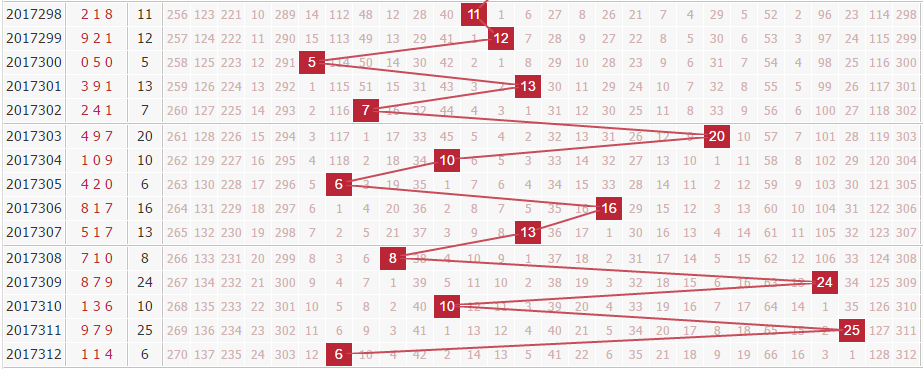 上期的和值开出了6,和值分布在第一区域,最近连续几期的和值分布波动非常大,分析近期的和值走势来看,本期和值有望上升,推荐关注第二区域以及第三区域前部的和值开出,推荐关注和值:10 13 16 19