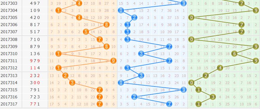 十位同上,近50期中,开出7到3有2次,到1有1次。首先排除1路的号,再排遗漏期数多的8、6,几率小的2、9,本期选择0、3、5。