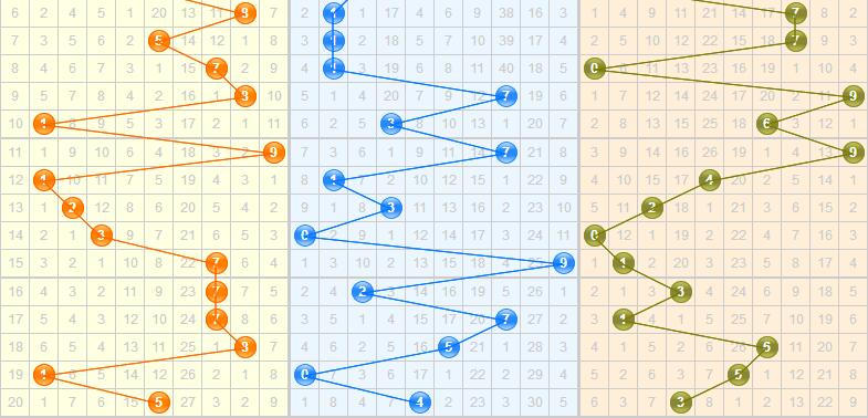和值分析:上期的和值为12点,按照目前和值走向看,上期再度回到了第二区间内,在振幅上有略微缩小,预计本期号码范围在8-17之间,可以小防一下大和值21。