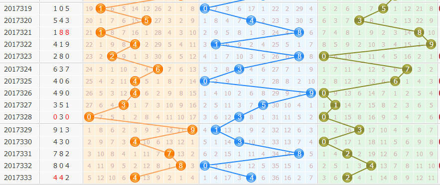 17333期开出了号码442,和值10,偶偶偶,小小小形态。