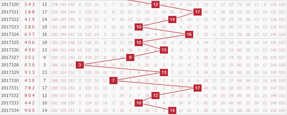 上期的和值开出了14,和值分布在第第二区域中部,分析近期的和值走势来看,近期的和值整体上集中在第二区域范围内开出,近期和值变化的幅度也相对较小,本期建议继续关注该区域的和值开出。推荐关注和值:10 11 15 16 17
