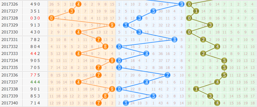 ③012路分析:为0路出0个,1路出3个,2路出0个;本期看好0路球出号,关注0码,综合分析看好,001 011路组合出号。