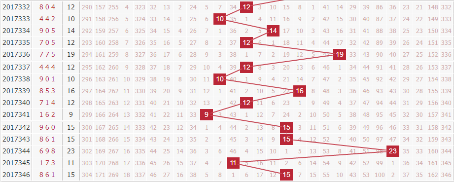 上期的和值开出了15,和值分布在第二区域中部,分析近期的和值走势来看,近期的和值整体上集中在第二区域范围内开出,上期和值上升,本期看好和值继续小幅上升。推荐关注和值:12 15 18 21