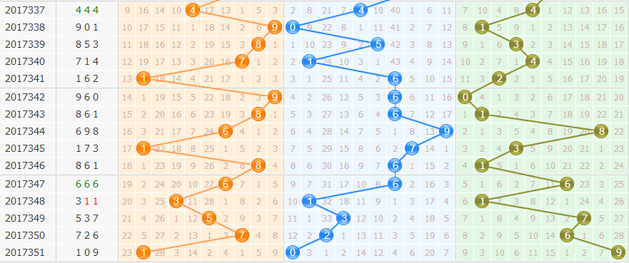 十位大、偶、温、1路是本期十位数上的首选,从上面的条件中我们可以得出首选4,而次一级关注7这个数。