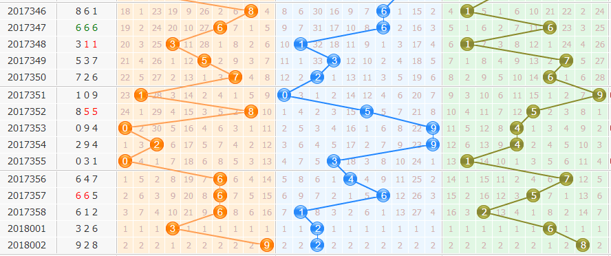 从近50期看,开出9有6次,到8有2次,到1、4、7有1次。我们从“遗漏表”中得出。首先排除0路的号,再排遗漏期数多的4,几率小的2、8,本期选择1、5、7。