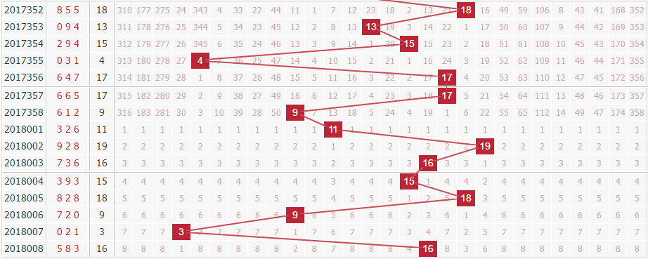 上期的和值开出了16,和值从第一区域的小和值直接进入第二区域的后部,合适大幅度地上升。分析近期的和值走势来看,近期和值的分布相对前段时间来说比较分散,上期和值较大幅度上升,本期建议关注一下和值变化幅度缩小。推荐关注和值:10 13 15 18