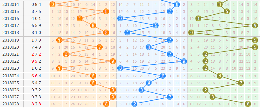 从近50期看,开出8有11次,到7有3次,到6有2、0次,到4、1有1次,重复1次。我们从“遗漏表”中得出。首先排除2路的号,再排遗漏期数多的3、0,几率小的9、6,本期选择1、4、7。