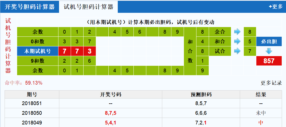 今晚试机号开出组三形态,两大一小组合,根据近期的出号形态分析,今晚是可以小防一下对子号开出的。从试机号开奖号码走势图上分析,最近的试机号号码分布的位置还是比较的分散的,今晚依旧是保持这个风格,最近试机号命中情况也是非常的好.本期试机号胆码计算器推荐胆码:857,是不是觉得非常眼熟,是的,这三个号码恰好就是上期的三个开奖数字,按照这个状态来看,三个当中出现一个的概率非常的高咯!毕竟重复号码近期的走势还是不错的,重点比较看好的一个重复号应该是号码7,所处位置比较热门,本期建议大家重点关注。