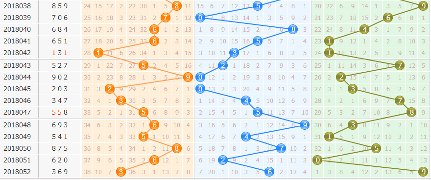 ③012路分析:为0路出3个,1路出0个,2路出0个;本期看好1路球出号,关注4码,综合分析看好,001 011路组合出号。